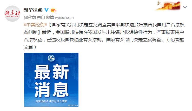 【國家有關部門決定立案調查美國聯(lián)邦快遞涉嫌損害我國用戶合法權益問題】最近,美國聯(lián)邦快遞在我國發(fā)生未按名址投遞快件行為,嚴重損害用戶合法權益,已違反我國快遞業(yè)有關法規(guī)。國家有關部門決定立案調查。(記者趙文君)