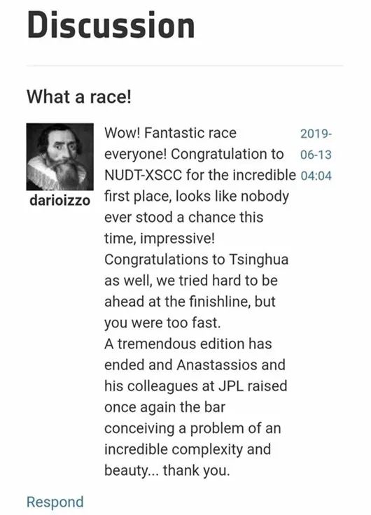 (內容翻譯如下:wow,精彩的比賽!向不可思議的第一名NUDT-XSCC隊伍致敬,這一次他們的優異表現讓其他隊伍根本毫無機會,讓人印象深刻。同樣祝賀清華大學,我們的隊伍在比賽末段非常盡力追趕,但你們實在是太快了。我們剛剛完成了非常精彩的一個<軟件>版本,Anastassios和他在JPL的同事再次在這個集復雜和美學于一體的問題上更上一層樓,謝謝你們。)