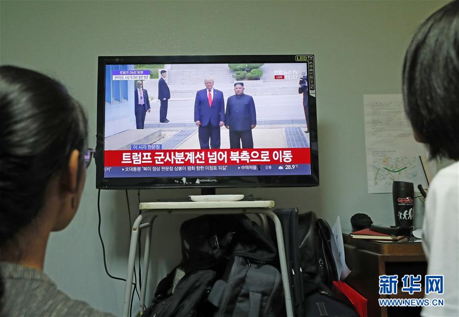 6月30日,韓國首爾市民在家里收看朝鮮最高領(lǐng)導(dǎo)人金正恩(屏幕右側(cè))與美國總統(tǒng)特朗普會面的電視直播。 據(jù)韓國媒體報(bào)道,美國總統(tǒng)特朗普30日在板門店與朝鮮最高領(lǐng)導(dǎo)人金正恩會面,這是兩人繼新加坡會晤和河內(nèi)會晤后的第三次會面。 新華社記者王婧嬙攝