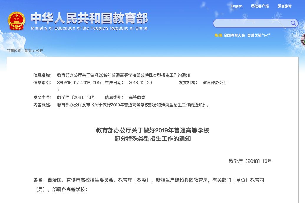 中國青年報(ID:zqbcyol)注意到,近日,教育部下發《關于做好2019年普通高等學校部分特殊類型招生工作的通知》,發布2019年普通高等學校部分特殊類型招生基本要求。
