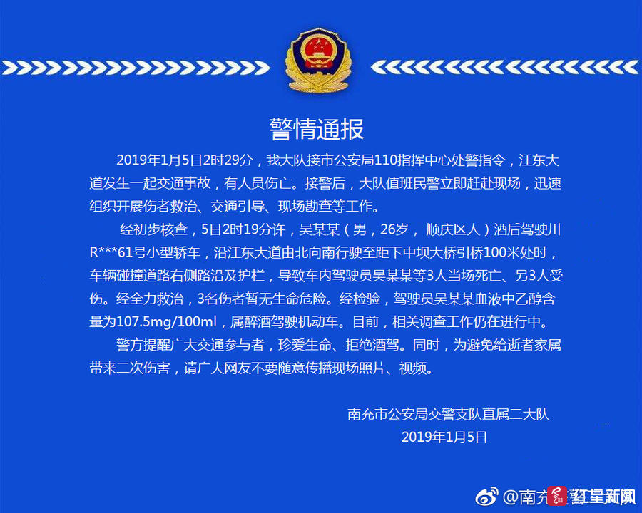 經初步核查,5日2時19分許,吳某某(男,26歲,順慶區人)酒后駕駛川R***61號小型轎車,沿江東大道由北向南行駛至距下中壩大橋引橋100米處時,車輛碰撞道路右側路沿及護欄,導致車內駕駛員吳某某等3人當場死亡、另3人受傷。經全力救治,3名傷者暫無生命危險。