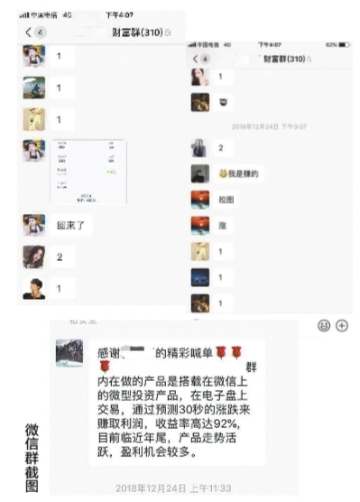 起初,何先生也只是旁觀者心態,認為加個群看看無所謂,而且已墜入桃花迷魂陣中的他對于“美女”的要求是千依百順。但群內連續多日的投資盈利消息,讓何先生再也按捺不住。群里的網友“注金”5000元后,按照群中“分析師”“預測師”所謂的“投資策略”,不到一分鐘,收益可以高達1000余元。