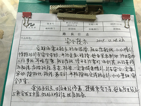 22路調度室的《路隊日志》。每名駕駛員上班前都要先閱讀安全提示并簽字。