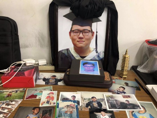 他自小生活的老房子里,現在還住著年近80歲的爺爺、奶奶。走進房間,他的本科畢業學士服遺像擺在桌上,從孩童到少年的照片一張張鋪開。