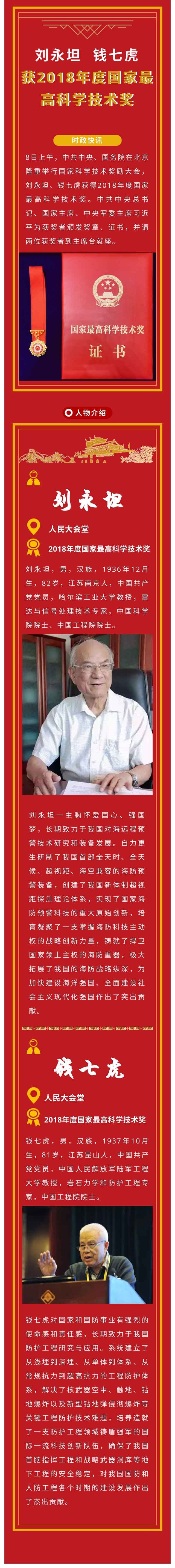 8日上午,中共中央、國務院在北京隆重舉行國家科學技術獎勵大會,劉永坦、錢七虎獲得2018年度國家最高科學技術獎。中共中央總書記、國家主席、中央軍委主席習近平為獲獎者頒發獎章、證書,并請兩位獲獎者到主席臺就座。