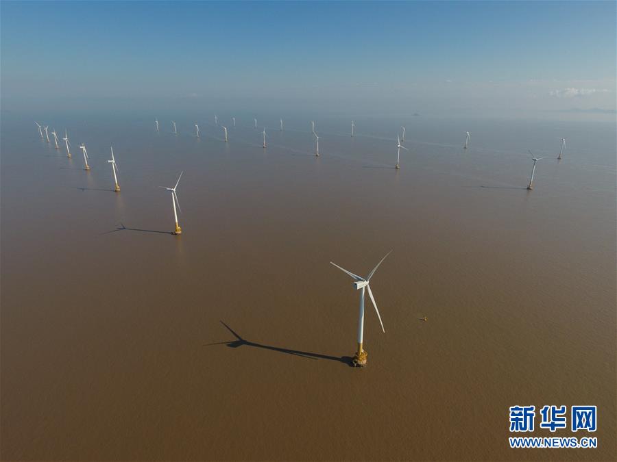 俯瞰上海東海大橋海上風電場(2017年11月2日攝)。 新華社記者 丁汀 攝