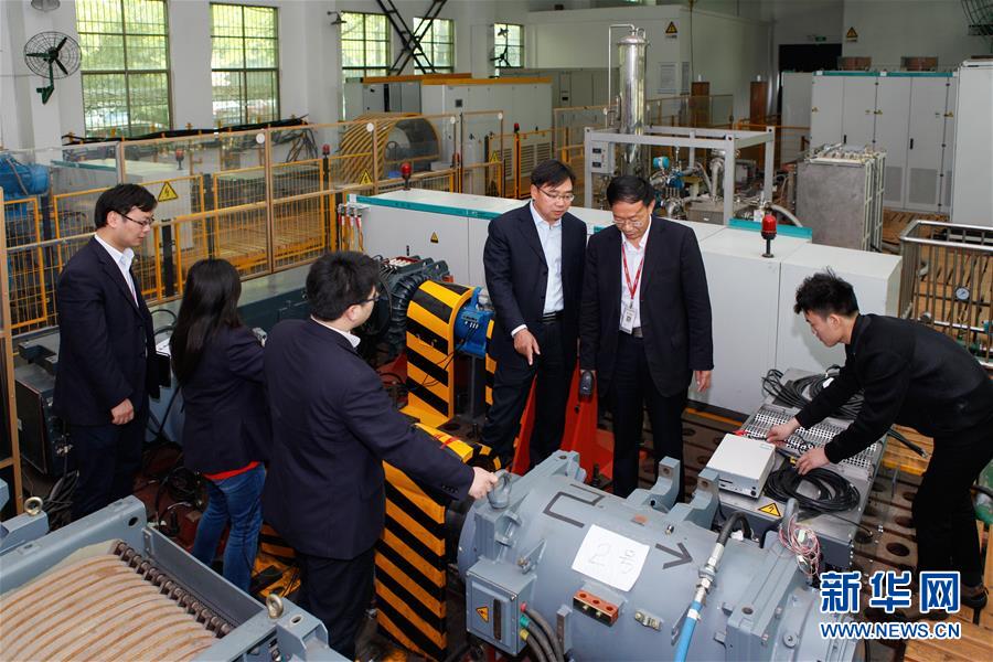 中車株洲電力機車研究所副總經理、總工程師馮江華(右三)在指導地鐵永磁直驅電機試驗(2016年3月21日攝)。 新華社發(劉亞鵬 攝)