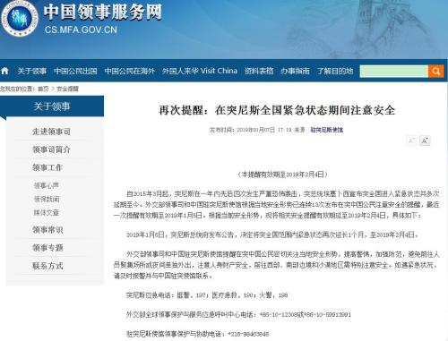 參考消息網(wǎng)1月9日報道 中國外交部領(lǐng)事司官方公眾號“領(lǐng)事直通車”1月8日發(fā)布消息,自2015年3月起,突尼斯在一年內(nèi)先后四次發(fā)生嚴重恐怖襲擊,突總統(tǒng)埃塞卜西宣布突全國進入緊急狀態(tài)并多次延期至今。外交部領(lǐng)事司和中國駐突尼斯使館根據(jù)當?shù)匕踩蝿菀堰B續(xù)13次發(fā)布在突中國公民注意安全的提醒,最近一次提醒有效期至2019年1月5日。根據(jù)當前安全形勢,現(xiàn)將相關(guān)安全提醒有效期延至2019年2月4日,具體如下: