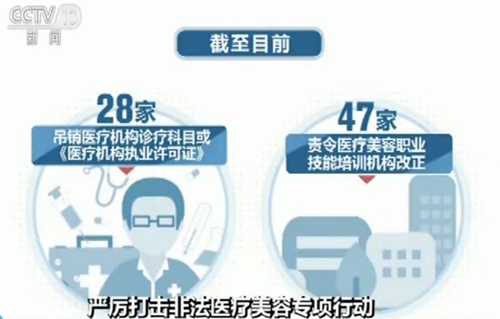近年來,越來越多的消費者選擇“微整形”醫療美容,一些人為牟取利益,非法制售使用膠原蛋白、肉毒毒素等藥品和醫療器械,危害消費者健康。此次專項行動重點打擊無證行醫,查處生活美容機構以及其他機構未取得相應資質,開展注射美容等醫療美容行為;查處利用賓館酒店、會所、居民住宅等場所違法開展醫療美容行為;打擊走私醫療美容相關藥品、醫療器械行為;查處不具備資質的培訓機構違規開展“微整形”等醫療美容培訓。截至目前,共吊銷醫療機構診療科目或《醫療機構執業許可證》28家,責令47家醫療美容職業技能培訓機構改正,2家停業整頓,責令743條醫療美容廣告予以改正。全國公安機關共搗毀制售假藥黑窩點728個,總涉案金額近7億元,全國海關立案偵查、調查各類膠原蛋白、肉毒毒素等走私違法犯罪案件912起。