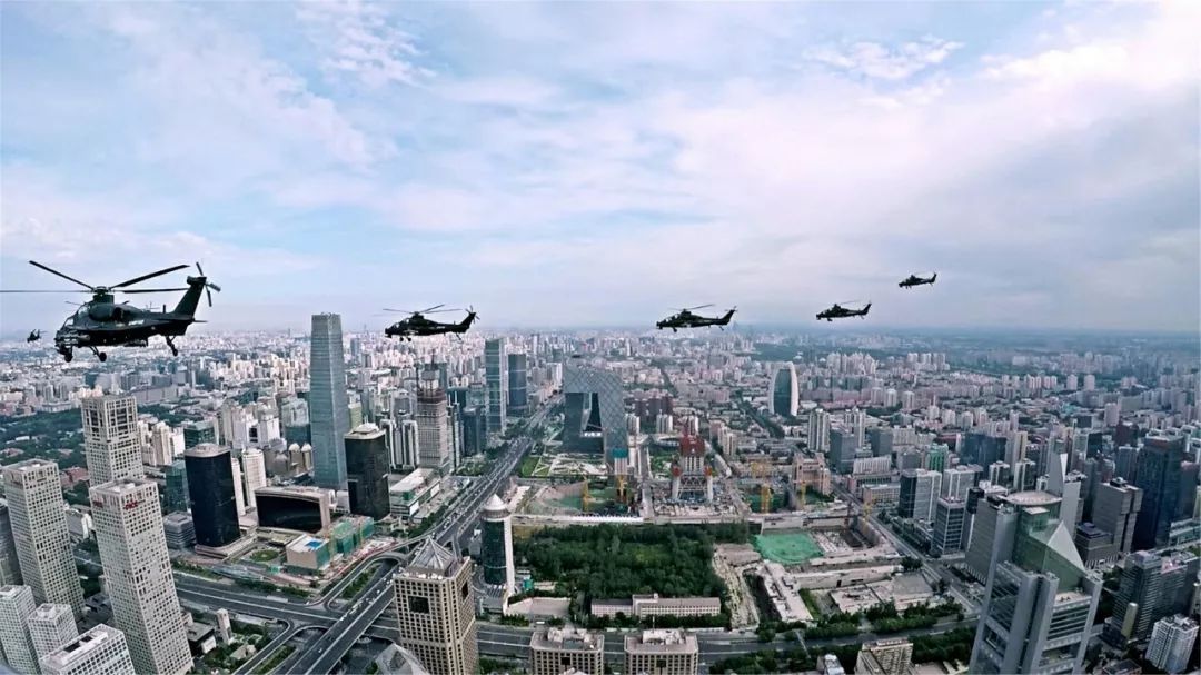 圖為武直-10編隊參加9·3閱兵過程中飛過北京上空。曹耀輝攝