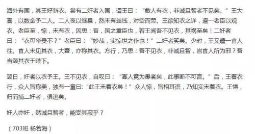 703班學生楊若海改編的結局為“王懼,歸而捕二奸者,俱逃矣。奸人亦奸,然誠且智者,能受其蔽乎?”意思是說,壞人固然奸詐,但如果國王誠實而且智慧,怎么會受其蒙蔽呢?”