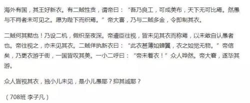有同學將童話進行了“提煉”,如原文結局為:“皇帝有點兒發抖,因為他似乎覺得老百姓所講的話是對的。不過他自己心里卻這樣想:’我必須把這游行大典舉行完畢。’因此他擺出一副更驕傲的神情,他的內臣們跟在他后面走,手中托著一個并不存在的后裾。”