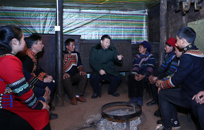 2018年2月11日上午,習(xí)近平在涼山彝族自治州昭覺(jué)縣三岔河鄉(xiāng)三河村貧困戶吉好也求家中看望。新華社記者 鞠鵬 攝