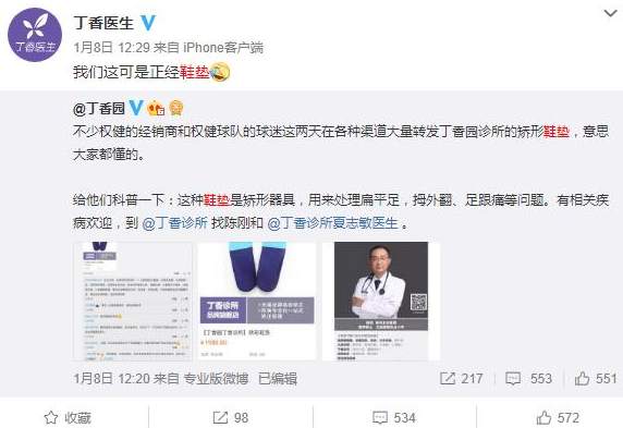1月11日,一篇自媒體文章,再次將爭議炒熱。該文指出,丁香園微博曾轉(zhuǎn)發(fā)“新華社曝光南京一家公立醫(yī)院賣天價鞋墊”的新聞,但丁香診所在售的鞋墊同為“天價”,文章稱這是“雙標”(注:雙重標準)。