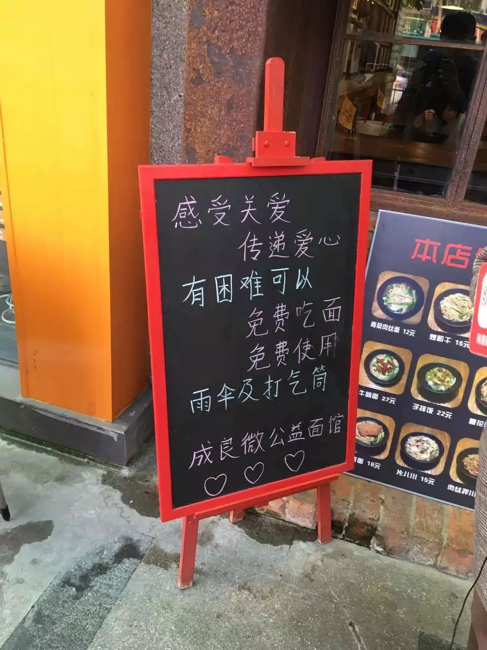 2013年,這家店開業了,店門口貼了一句話:當您遇到困難時,可以在成良面館免費吃上一碗熱氣騰騰的面。