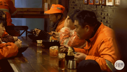 大家邊吃邊聊得不亦樂乎,在熱乎美味的面條里,他們放下了一天的疲憊,盡情享受此刻美食帶來的慰籍。