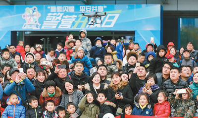 日前,江蘇省無錫市公安局警營開放日活動在該市體育中心舉行,市民在活動中觀看警用無人機演示。