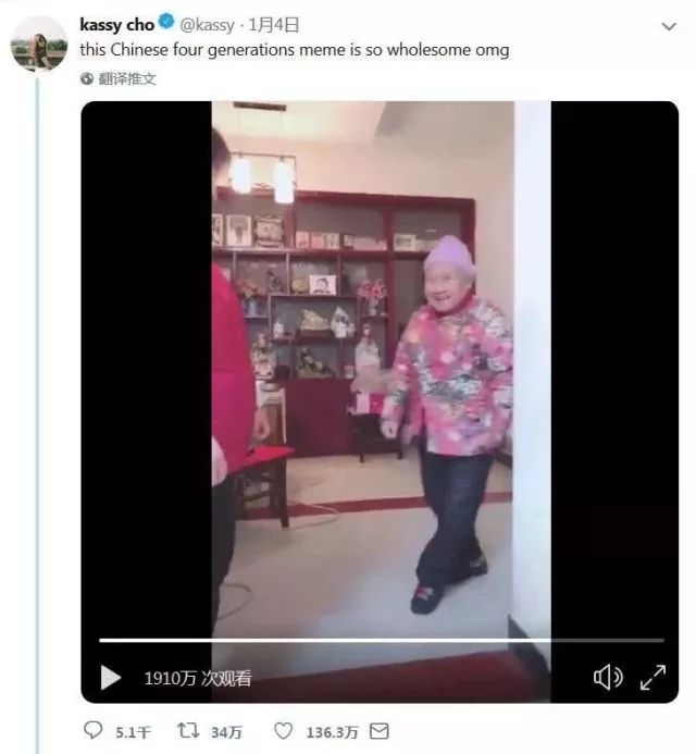 這則視頻,以及一系列國內網友的同款“四世同堂”短視頻,被國外網站的編輯發現并轉發到推特上,迅速火遍全球,不久就有34萬人轉發,136萬人點贊,點擊量超過1910萬。