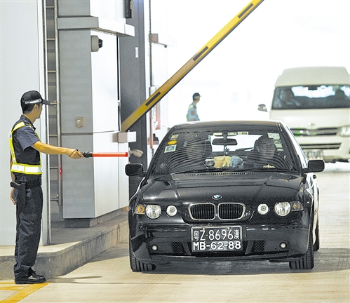 2018年10月24日,港珠澳大橋正式通車。圖為首輛私家車在澳門口岸離境車道上通關(guān)。 (新華社發(fā))