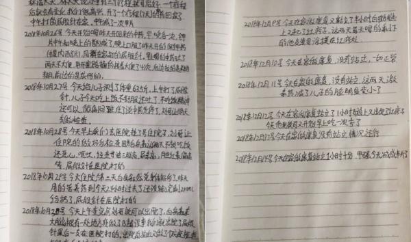 來北京之后,老白把兒子每天的情況都記錄在一個小本子上,“起初只是為了記錄孩子的體溫、大小便、體重以及看病生活開銷等情況,還有一些孩子特別的病理情況,后來習慣之后就把這當成兒子的抗癌日記,把兒子的喜怒哀樂我都記錄了下來。”200多天的在京抗癌歷程,寫了厚厚一本。
