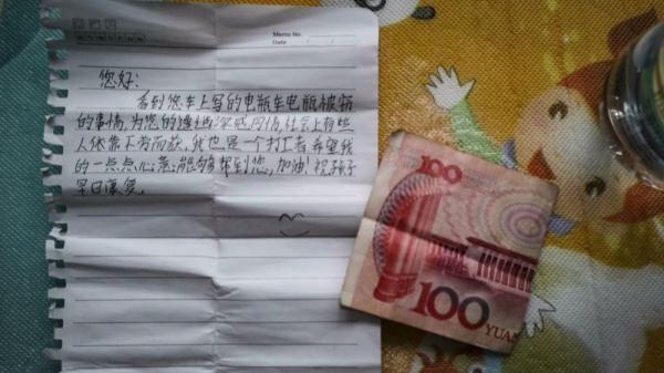 幾天之后,老白像往常一樣騎電瓶車去買菜,回來時發現車子上留了一張紙條,上邊寫著字并包著一百塊錢,“看到您的遭遇為您深感同情…我也是一位打工者,希望我的一點點心意能夠幫到您,祝孩子早日康復…”路人悄悄留字條鼓勵老白勇敢面對,并為孩子捐錢,讓老白不勝感激。