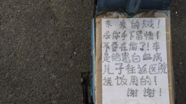 一位出院的病友家屬看老白一家困難,把一輛電瓶車送給老白,方便往返醫院、菜市場、出租屋,可是在兩個月前,這輛車的電瓶卻被賊給盜走了。換一組電瓶需要500多元,這對于沒有收入的一家又多了一份壓力,老白無奈在電瓶車上寫了一封懇求信。“如果下次還有賊來,我希望他能看到,理解我的困境,手下留情放我一馬。”