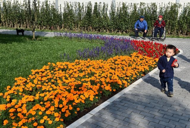上圖:2017年10月23日,居民在北京西革新里城市休閑公園內游玩。下圖:2017年10月23日,居民在北京西革新里城市休閑公園內賞花曬太陽。