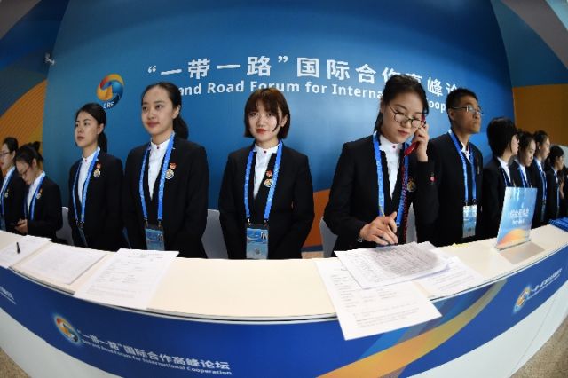 2017年5月13日,志愿者在北京國家會議中心綜合服務臺等候為來賓提供服務。
