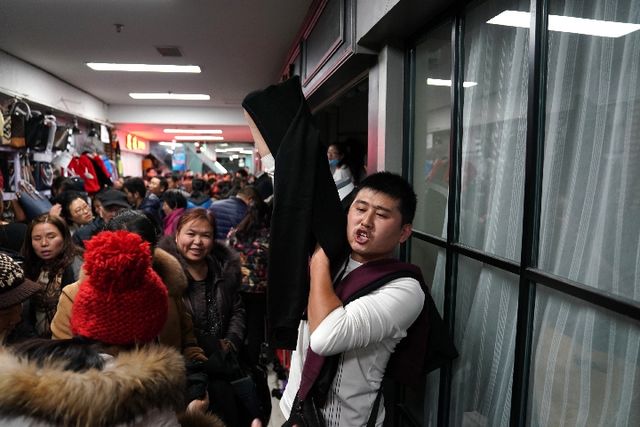 上圖:2017年11月30日,北京“動批”東鼎批發市場內,商戶甩賣商品。下圖:2017年5月4日,“動批”天皓成服裝批發市場改建成的“寶藍金融創新中心”內,一位員工調試無人機。