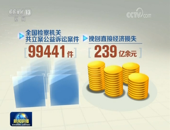 公益訴訟制度探索實施三年來,全國檢察機關共立案公益訴訟案件99441件,挽回直接經濟損失239億多元。