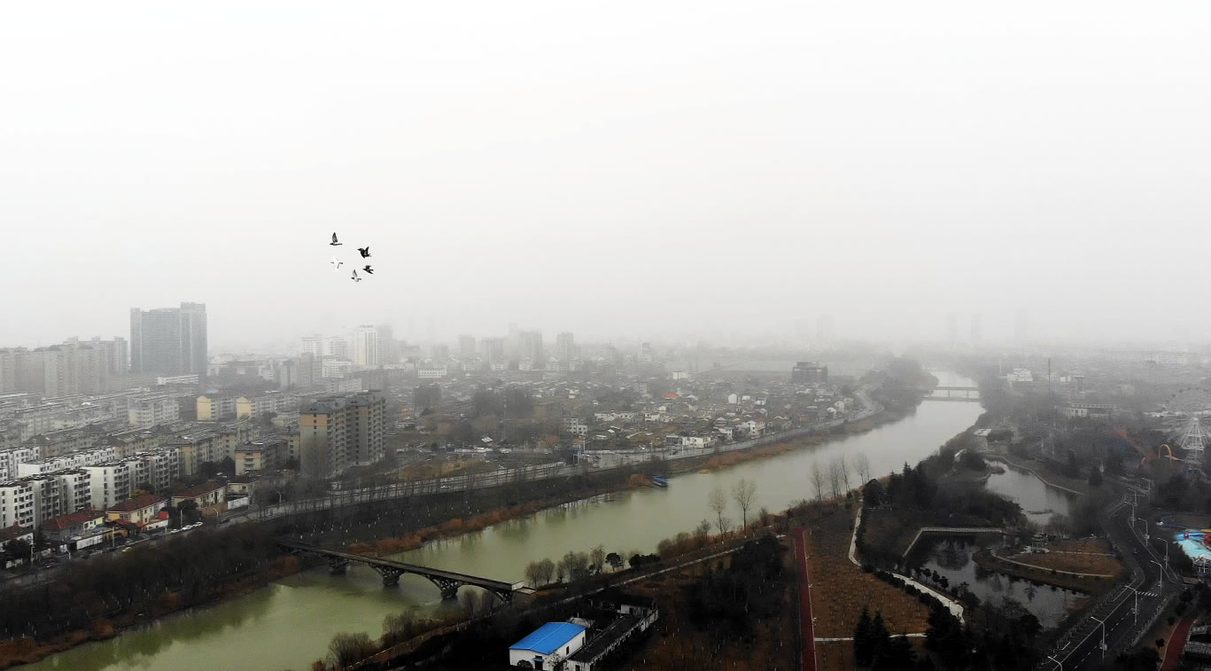 冬日淮陰,曾經的黃河故道,綠水如鏡,映照出河畔兩旁的濕地公園,健康步道上,三三兩兩晨練者跑過,天空中一群飛鳥盤旋著,像是對這片古老的土地戀戀不舍。