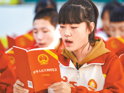 2018年12月4日,河北省阜城縣第四中學學生誦讀憲法教育讀本。