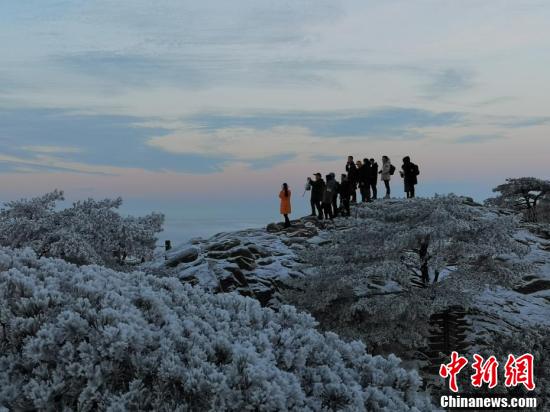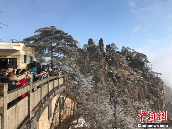 游客們行走于黃山峰巒之上,感受雪后美景。 文/余皓 侯晏 呂曉平 攝