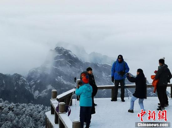 游客們在觀景平臺上拍攝雪后黃山美景。 文/余皓 侯晏 呂曉平 攝