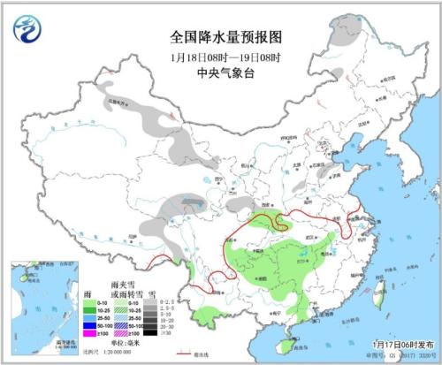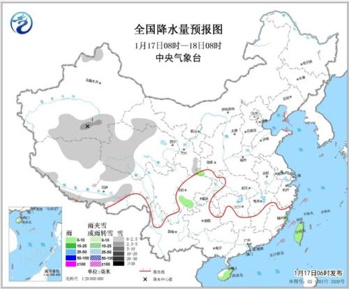 全國降水量預報圖(1月17日08時-18日08時)