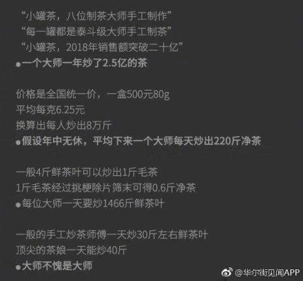 文章稱,小罐茶“一個大師一年炒了2.5億的茶”“假設全年無休,平均下來,一個大師每天炒出220斤凈茶”、“頂尖的茶娘一天才炒40斤,小罐茶大師累不累?”