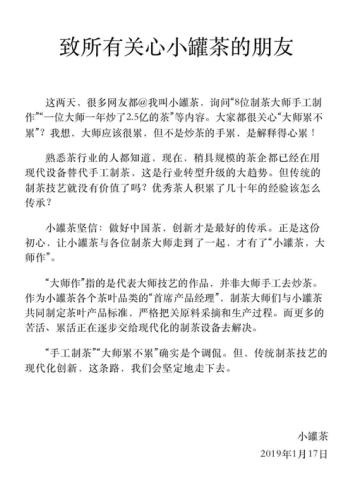 中新網客戶端北京1月17日電(記者 吳濤)17日,針對近日網友對小罐茶的質疑,小罐茶回應,“大師作”指的是代表大師技藝的作品,并非大師手工去炒茶。