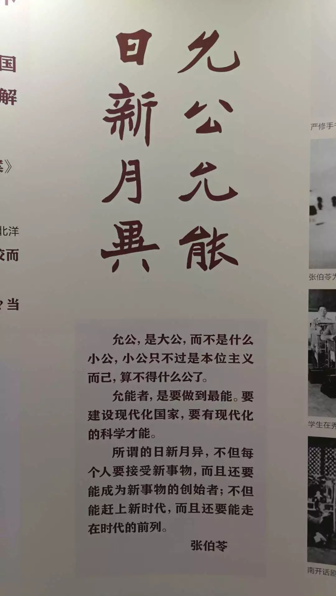 △校史主題展展板。張伯苓校長在1935年南開大學(xué)開學(xué)典禮上所問的三個問題——“張伯苓三問”。(央視記者石偉明拍攝)