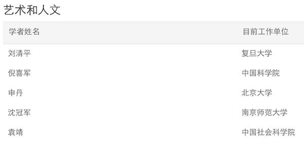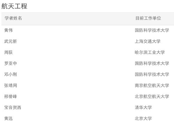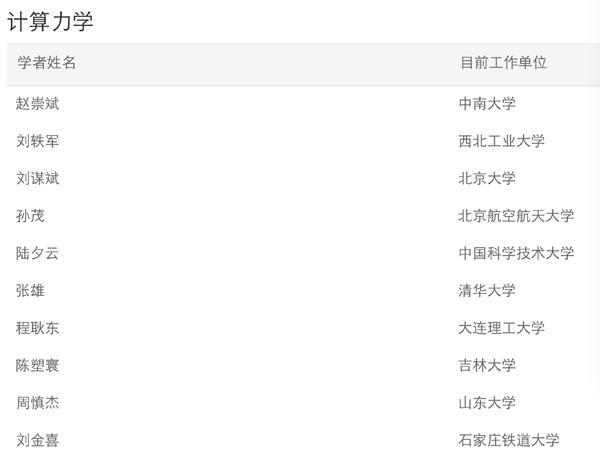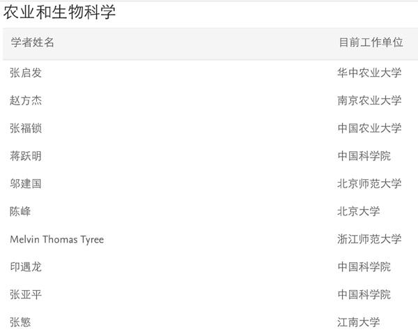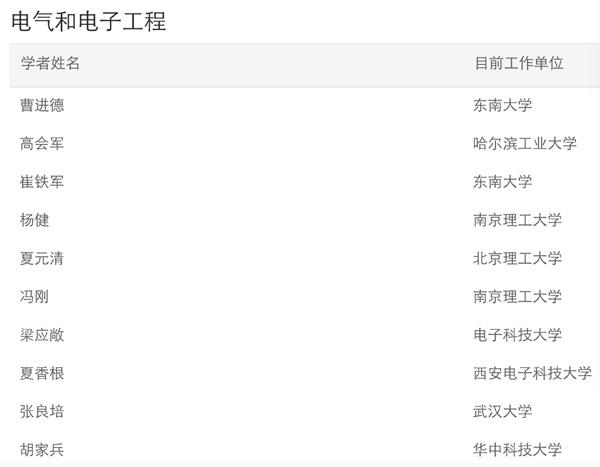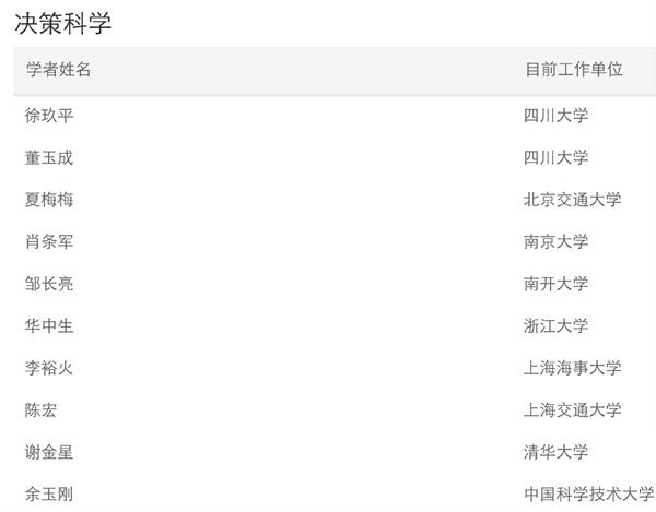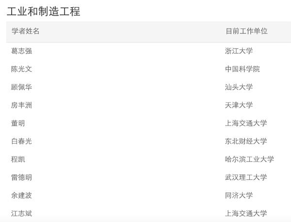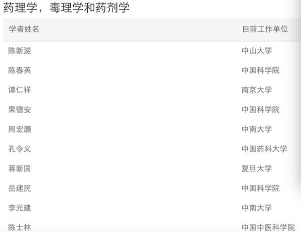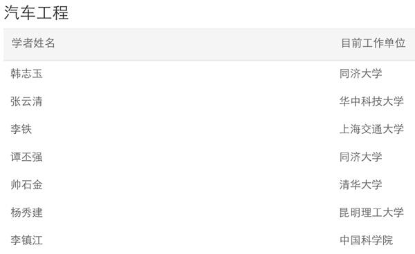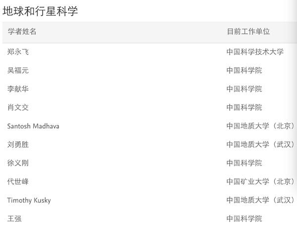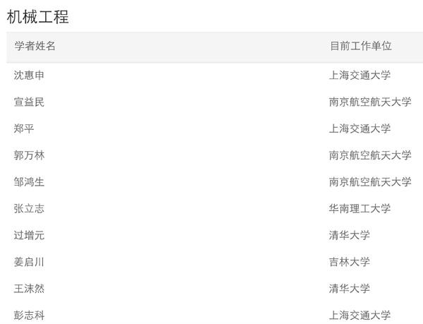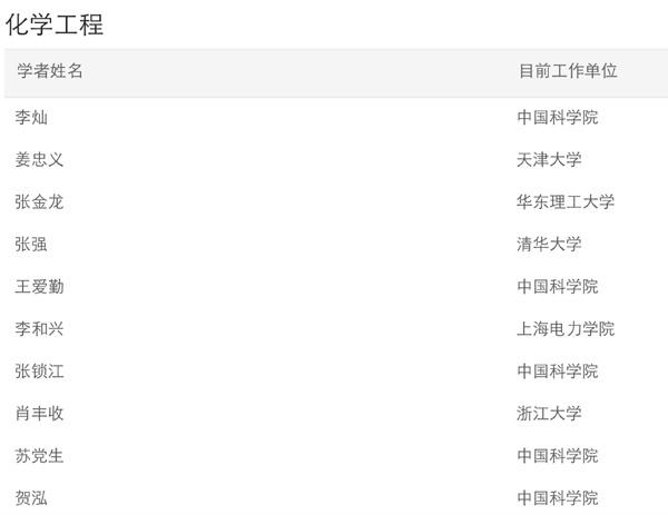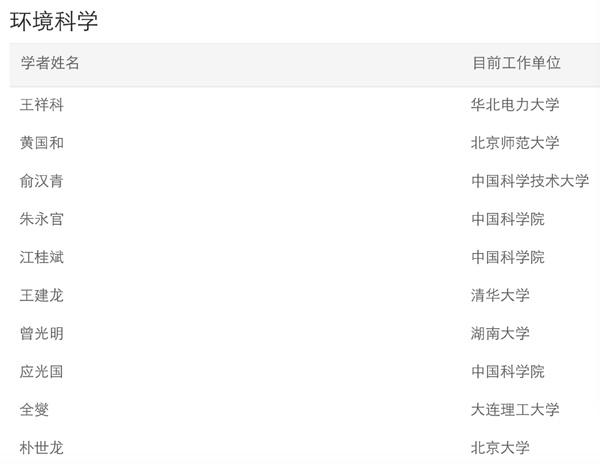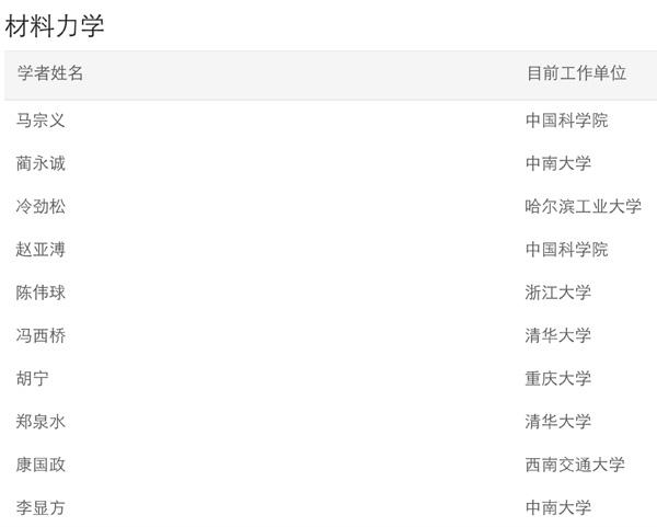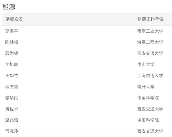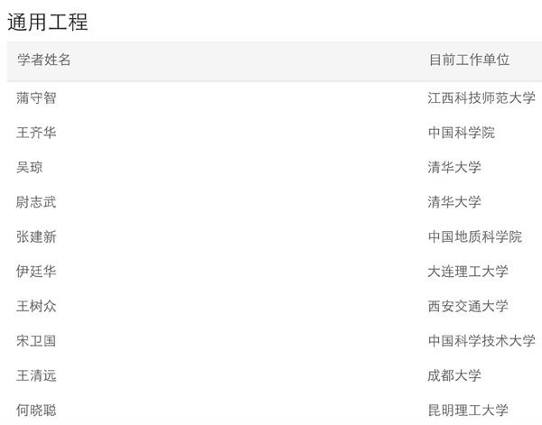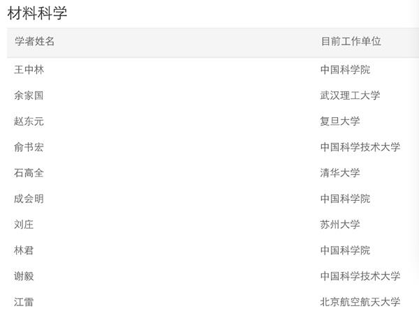 材料科學:中科院的王中林、武漢理工大學的余家國、復旦大學的趙東元、中國科學技術大學的俞書宏和清華大學的石高全。
