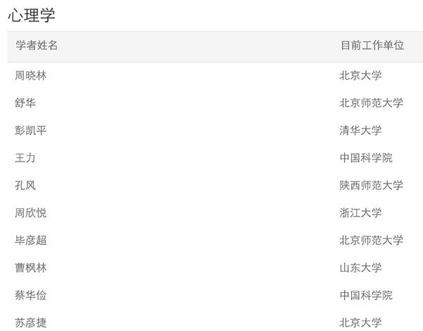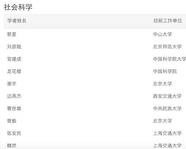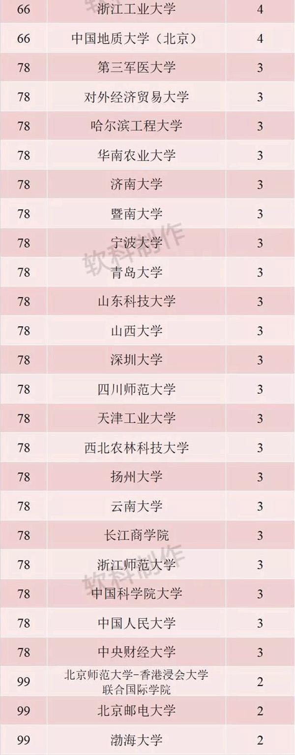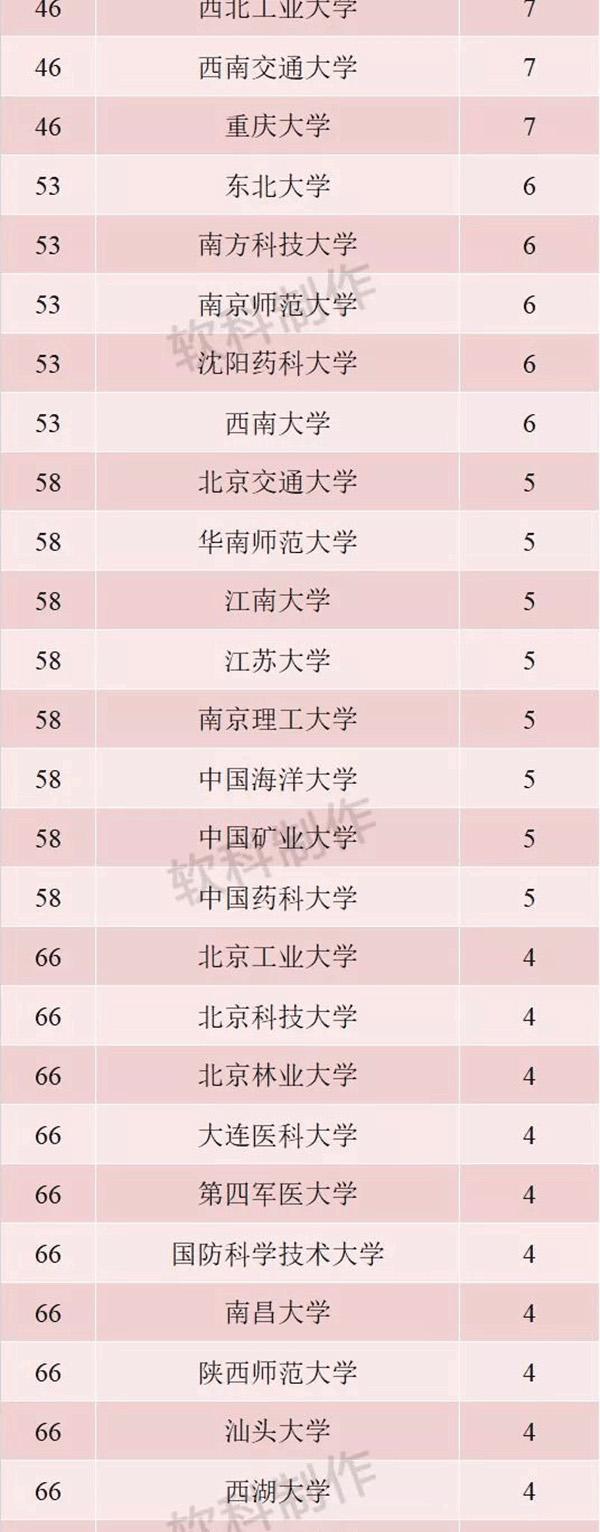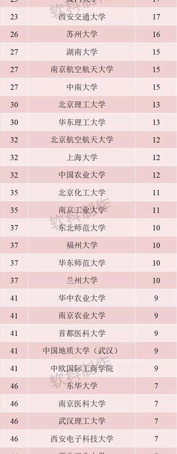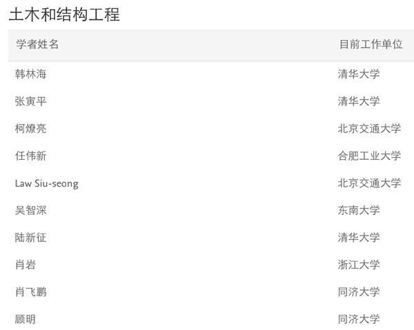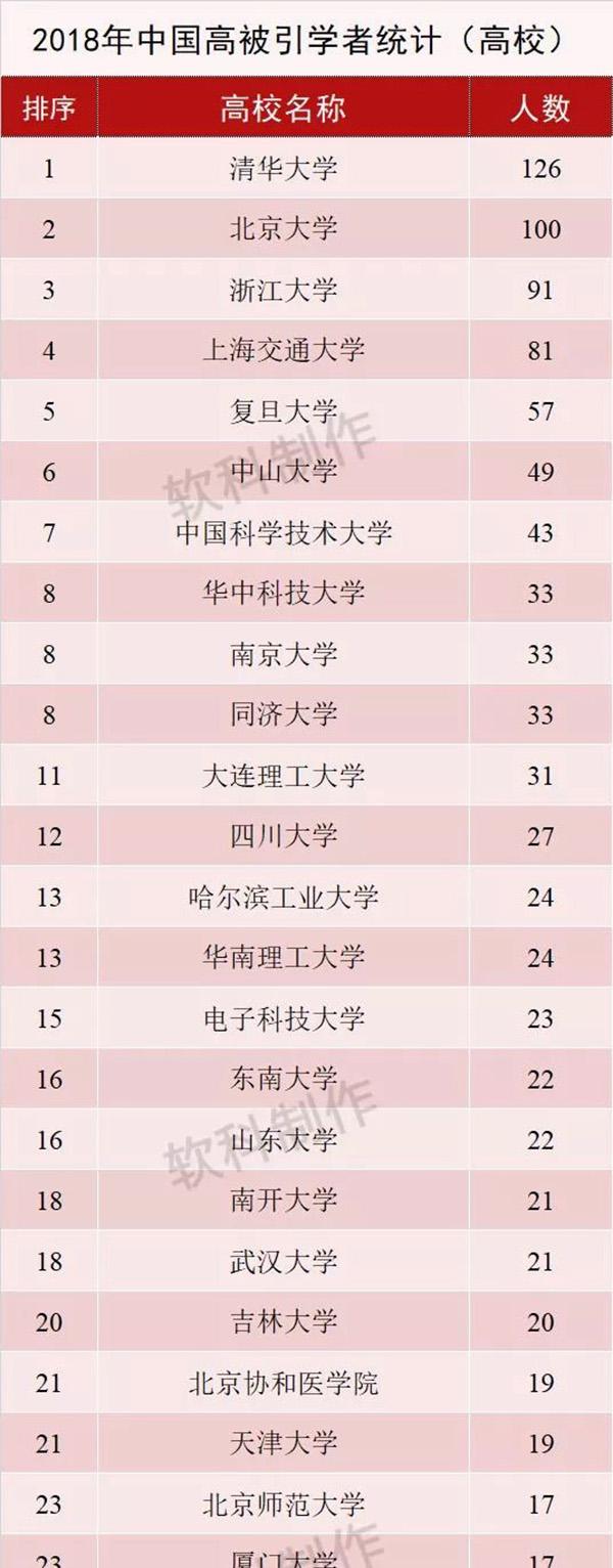 上榜學者數量排名第四至十的高校分別是:上海交通大學、復旦大學、中山大學、中國科技大學、華中科技大學、南京大學和同濟大學。