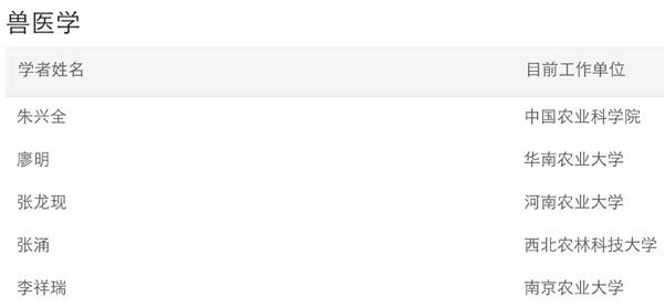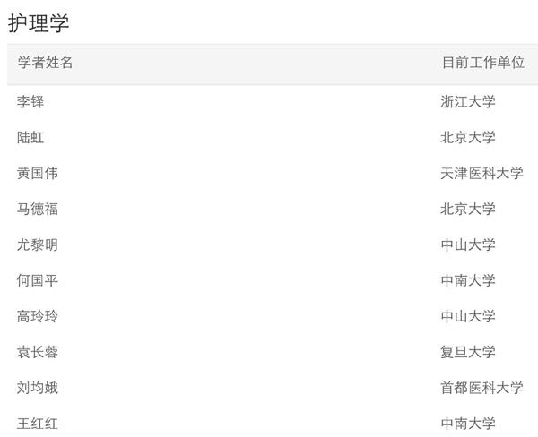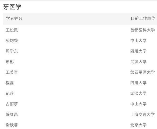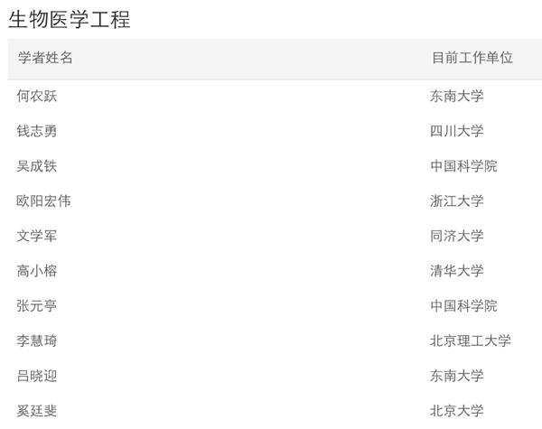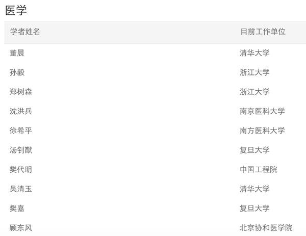 醫(yī)學:清華大學的董晨、浙江大學的孫毅、浙江大學的鄭樹森、南京醫(yī)科大學的沈洪兵和南方醫(yī)科大學的徐希平。