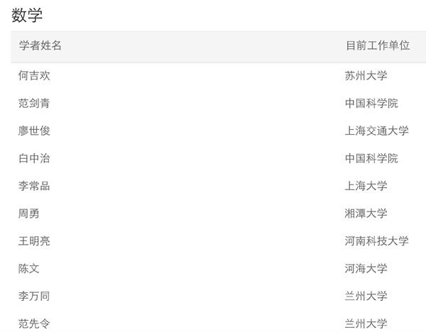 數學:蘇州大學的何吉歡、中國科學院的范劍青、上海交通大學的廖世俊、中國科學院的白中治和上海大學的李常品。