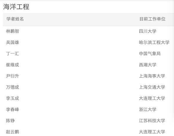 中國氣象局的丁一匯院士排在海洋工程領域的第三位,耄耋之年的他講一門《高等天氣學》講了40多年。在他之后排名第四的崔維成是載人潛水器“蛟龍?zhí)枴钡脑O計師,隨著他的作品下潛過太平洋馬里亞納海溝。該領域的第一和第二位分別是四川大學的林鵬智和哈爾濱工程大學的吳國雄。