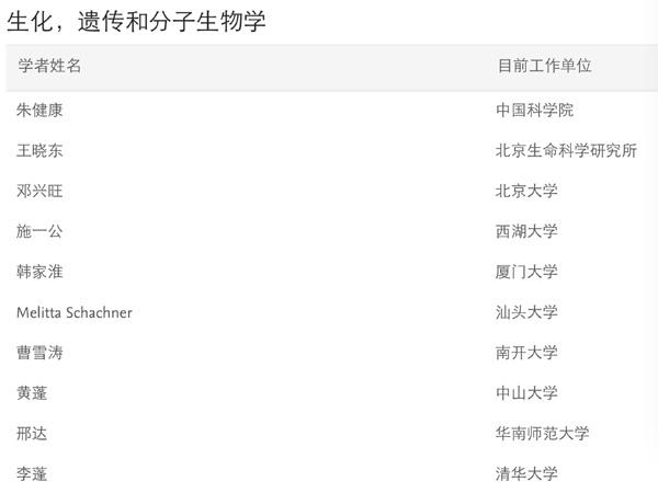 西湖大學校長、結構生物學家施一公院士排在生化,遺傳和分子生物學的第四位。前三位分別是中科院的朱健康、北京生命科學研究所的王曉東和北京大學的鄧興旺。