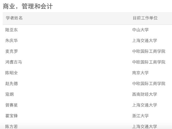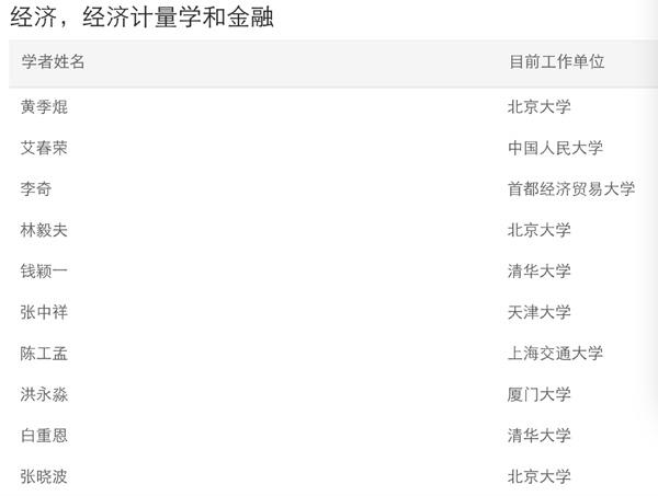 經濟、經濟計量學和金融:北京大學的黃季焜、中國人民大學的艾春榮、首都經濟貿易大學的李奇、北京大學的林毅夫和清華大學的錢穎一。