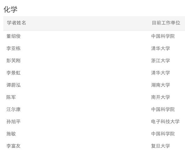 化學:中國科學院的董紹俊、清華大學的李亞棟、浙江大學的彭笑剛、清華大學的李景虹和湖南大學的譚蔚泓。