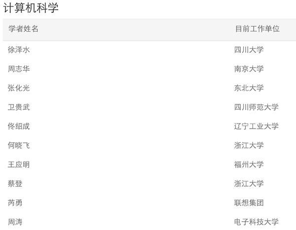 計算機科學:高被引學者分別為四川大學的徐澤水、南京大學的周志華、東北大學的張化光、四川師范大學的衛(wèi)貴武。