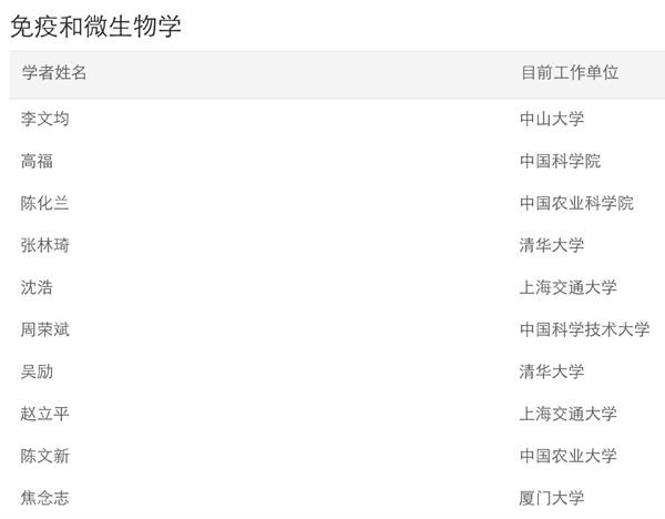 中國疾控中心主任高福院士排在免疫和微生物學領域的第二位。他在對抗流感、禽流感和埃博拉等病毒方面作出了舉世矚目的貢獻。中國畜牧獸醫(yī)界第一位女院士陳化蘭緊跟其后排在第三位。這個領域的榜首則是中山大學微生物學專家李文均。
