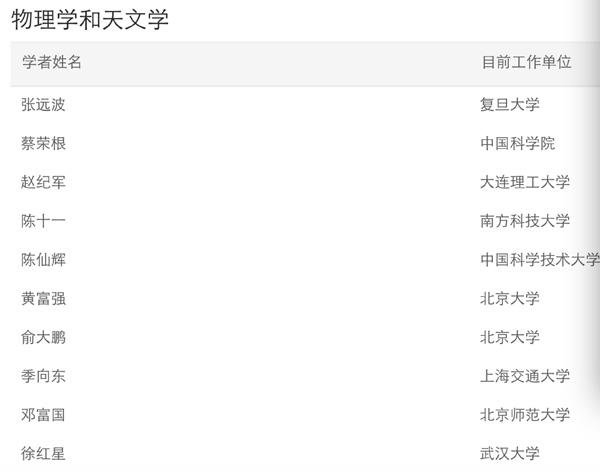物理學:復旦大學的張遠波、中國科學院的蔡榮根、大連理工大學的趙紀軍、南方科技大學的陳十一、中國科學技術大學的陳仙輝。