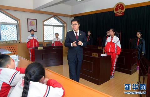 2017年12月4日,在河北省石家莊市建勝路小學舉辦的校園模擬法庭現場,石家莊市橋西區檢察院檢察官為學生們講解庭審程序。來源:新華社